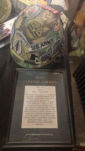"My Helmet captures my 23 years in the Army. Blending triumphs and trials. At 34 as a new nurse, as a single mom deep in debt. I Commissioned during the Gulf War. From 2003, I readied for Operation Enduring Freedom, deploying to Afghanistan in 2006 and Iraq in 2009 under Operation Iraqi Freedom. In 2010, I trained my team for their 2013 Afghanistan Tour. Retiring at 60 in 2014, I was promoted to Lieutenant Colonel on my birthday, July 7, a testament to my steadfast Service."-Catherine Anderson
